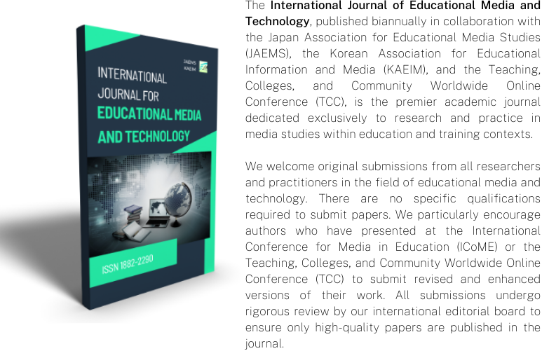 We are pleased to announce the call for papers for the International Journal for Educational Media and Technology (IJEMT), 19(1), which will be jointly published in August 2025 by the Japan Association for Educational Media Studies (JAEMS), the Korean Association for Educational Information and Media (KAEIM), and the Teaching, Colleges, and Community Worldwide Online Conference (TCC).